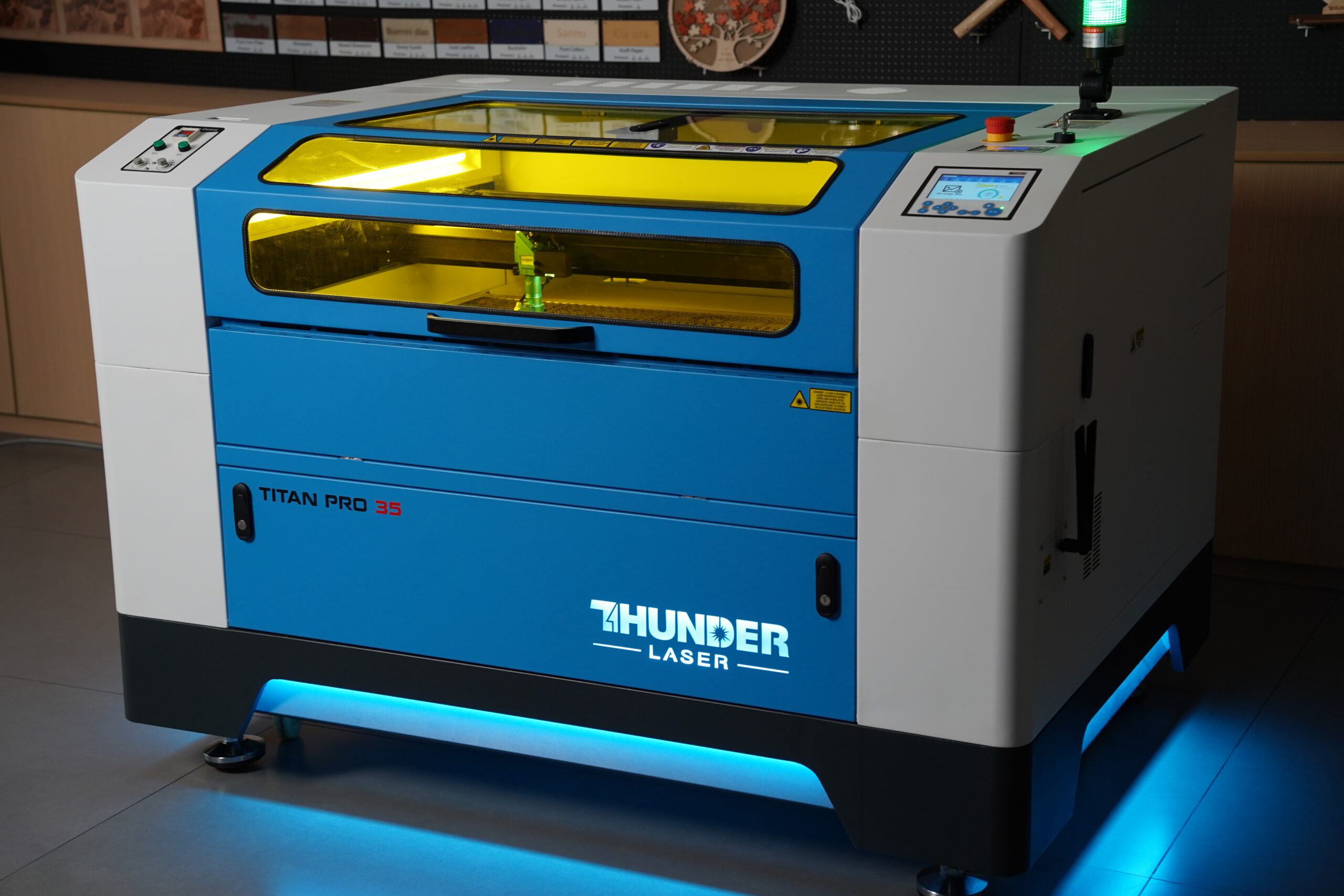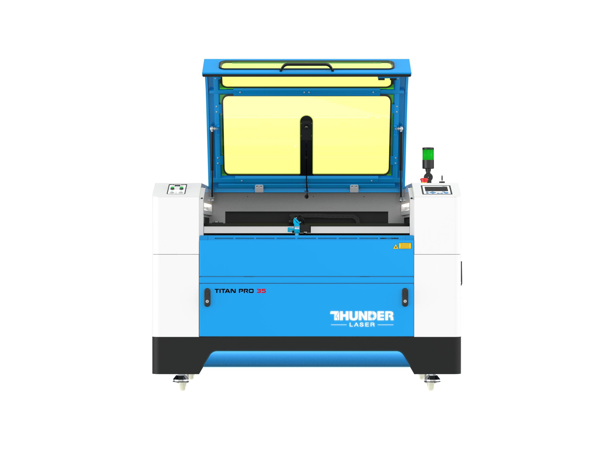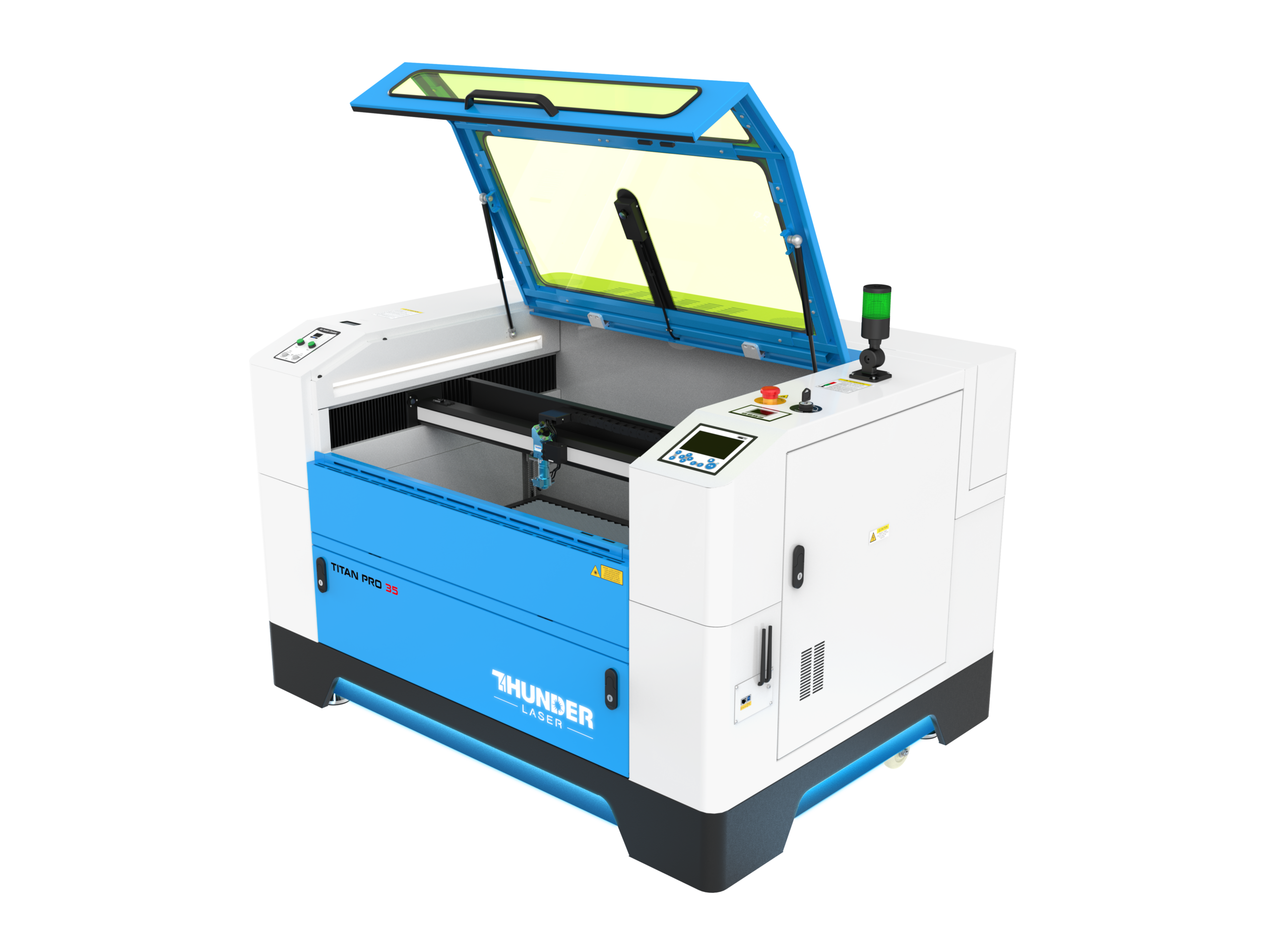 THUNDER LASER – Série TITAN – Machines de découpe & gravure laser hybride (CO₂ RF tube métal + Fibre MOPA sur version PRO) de Classe 1